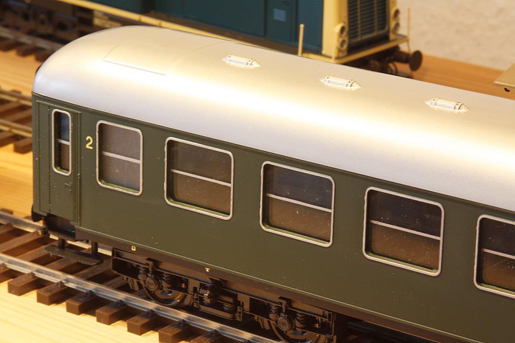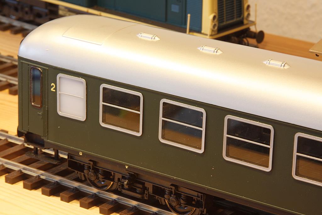 Neuerdings bietet Peter Lehmann aus der Schweiz gefräste Plexiglasscheiben an, die passgenau in die Fensteröffnungen des D-Zug Wagens gesetzt werden. Dazu gibt es passgenau aus Neusilber geätzte Rahmen, die auf die am Wagenkasten vorhandenen Fensterrahmen aufgeklebt werden.