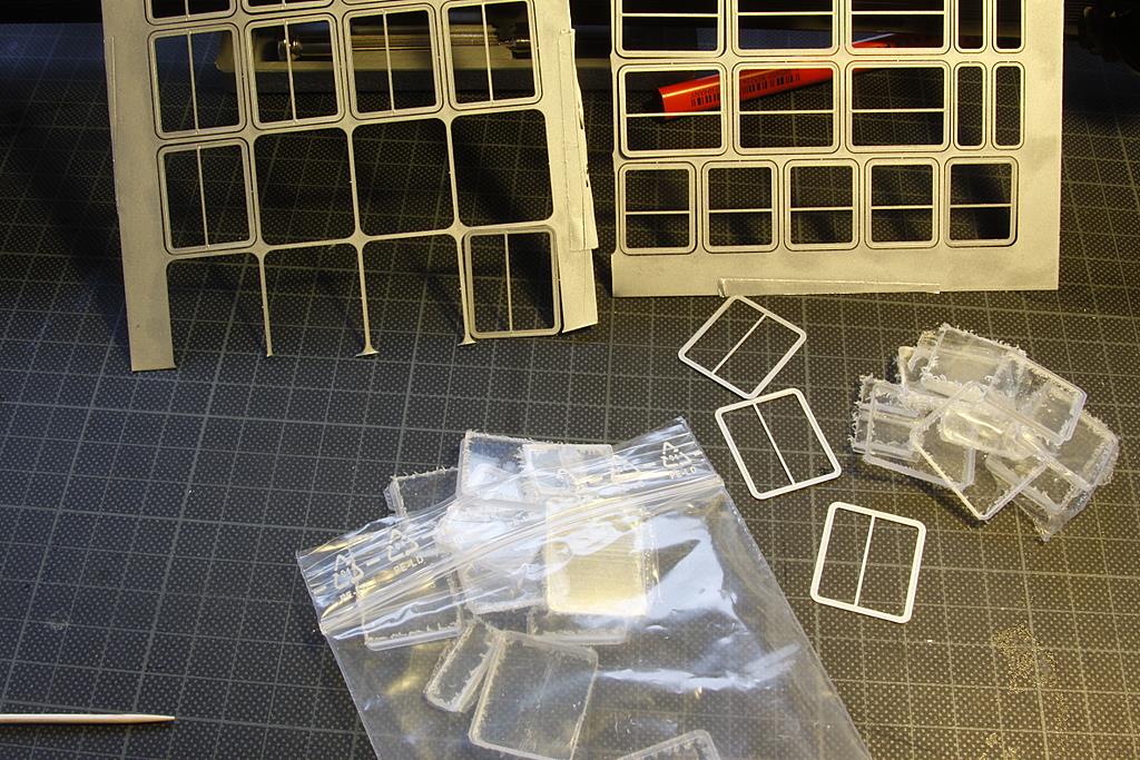 Ich habe die Rahmen lackiert, ohne sie vorher aus dem Trägerblech herauszutrennen. Das geht nämlich anschließend mit einer feinen, spitzen Schere ganz leicht und auch so, dass der Steg zwischen dem Fensterrahmen und dem Trägerblech sauber abgetrennt ist. Eine Nacharbeit war auch hier nicht erforderlich.