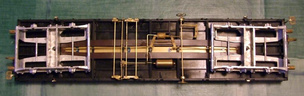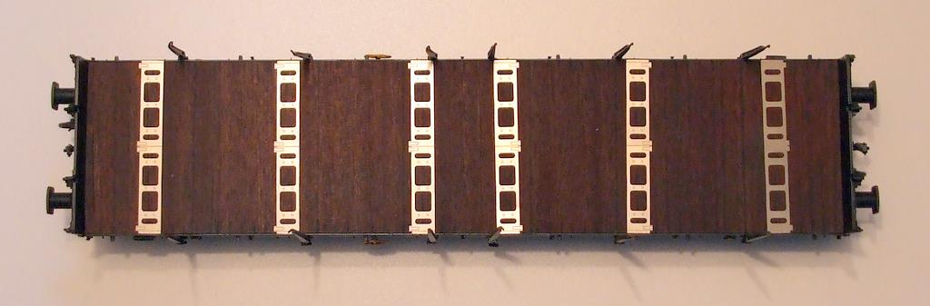 Nach dieser Arbeit habe ich den Wagenboden so bearbeitet, dass ich in den mittleren Träger ein Vierkant-Messingprofil einarbeiten konnte. Dieses Profil erfüllt zwei Aufgaben: einmal erhöht das Profil die Steifigkeit des Wagenbodens und zum anderen steigt das Gesamtgewicht des Wagens etwas. Das Profil habe ich durch vier Schrauben mit dem Wagenboden verbunden.