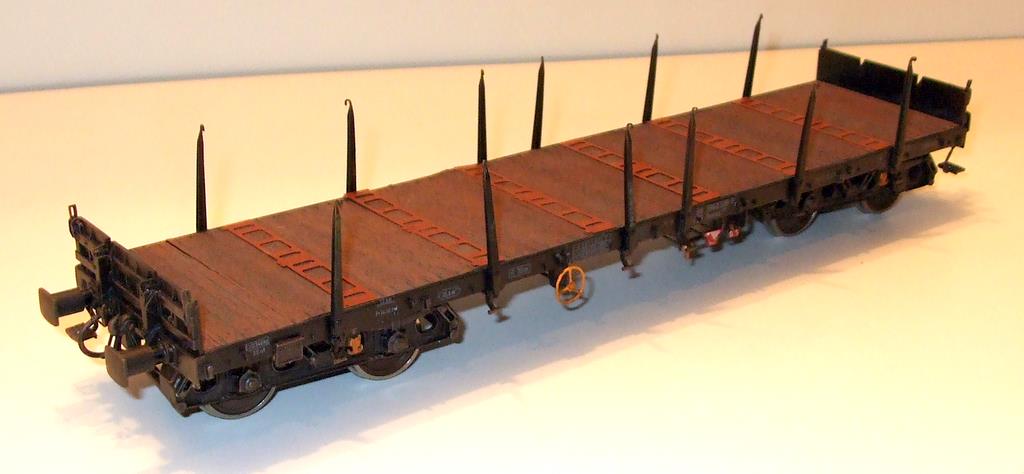 Ab Mai 2009 bietet die Firma Ndetail eine Ergänzung für diesen Wagen an: Ladeschwellen in Neusilberätztechnik. Diese Ladeschwellen wurden umgehend bestellt. Zuerst wurden die sechs Ladeschwellen aus dem Ätzblech herausgetrennt. Nach dem Versäubern der Teile habe ich diese gereinigt und anschließend mit Rostfarbe gestrichen. Es folgte das Platzieren der Ladeschwellen auf dem Wagen, geklebt habe ich in diesem Falle mit UHU Hart. Nach dem Abbinden des Klebers erfolgte noch mal ein Überzug mit mattem Klarlack, und schon kann der Wagen wieder in Betrieb gehen. Der Wagen hat mit diesen Ladenschwellen ungemein an Vorbildtreue gewonnen.