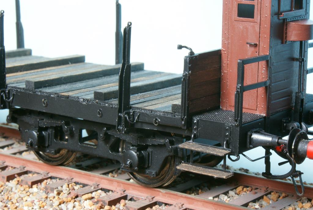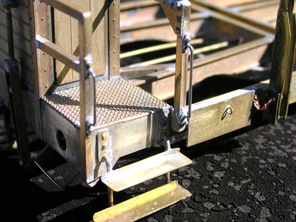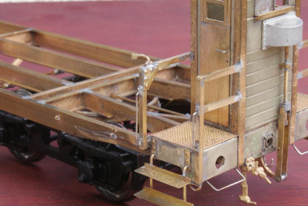 Das Bremserhaus besteht aus Neusilberblech, in das die Bretterfugen eingefräst wurden. Ätzen wäre sicher auch eine Möglichkeit, aber wenn man eine Fräse in der Werkstatt stehen hat, geht es so schneller und einfacher. Für die Griffe am Aufstieg wurden auch die Laschen nachgebildet.