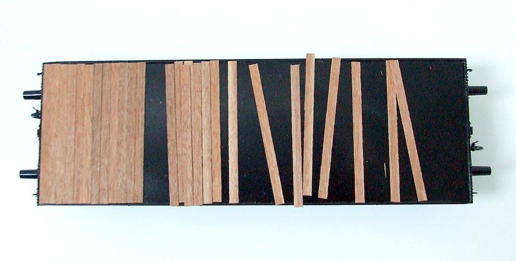 Der neue Wagenboden besteht bei mir aus einem massiven Messingblech in 1 mm Stärke. Darauf habe ich 0,5 mm starke Nussbaumleisten aus dem Schiffsmodellbau geklebt. Das war auch der aufwändigste Teil der Montage, galt es doch 3,50 m (!) von dieser Leiste auf dem Wagen zu verarbeiten. Das geschah, nachdem er lackiert war.