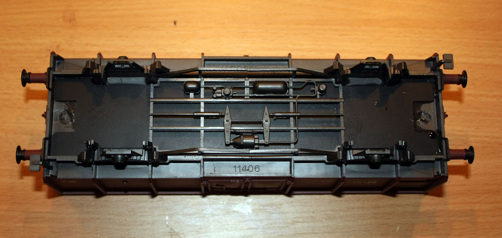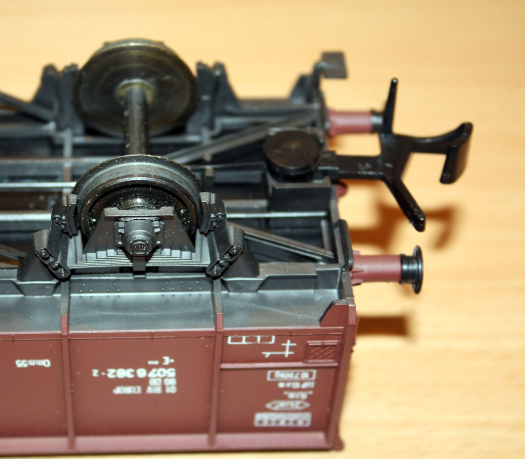 Die Demontage des Wagens ist einfach: Nach Entnahme der beiden Radsätze müssen nur die beiden Zapfen, mit denen die Kupplungen befestigt sind, herausgezogen werden. Diese Zapfen und die Kupplungen können beiseite gelegt werden, sie werden für den Umbau nicht weiter gebraucht.