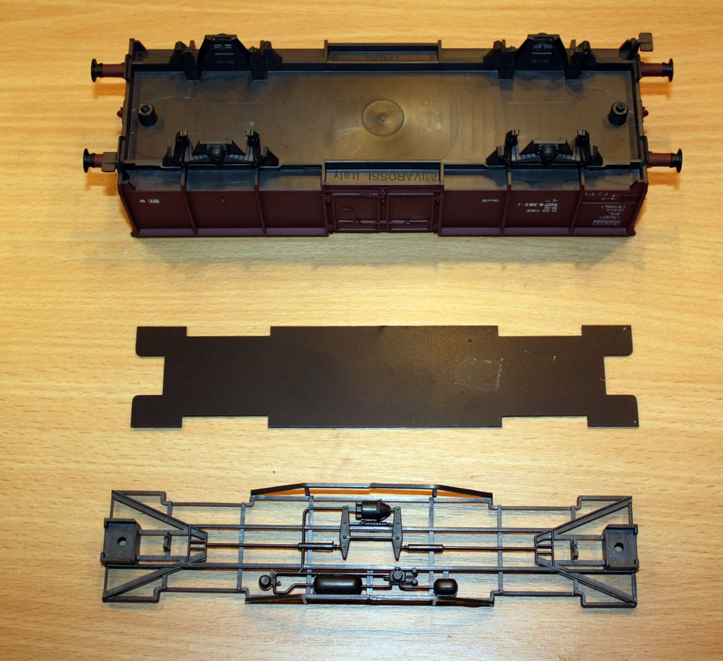 Nun „zerfällt“ der Wagen in drei Teile: Aufbau mit Rahmen, Ballastplatte und Einsatz mit Sprengwerk.