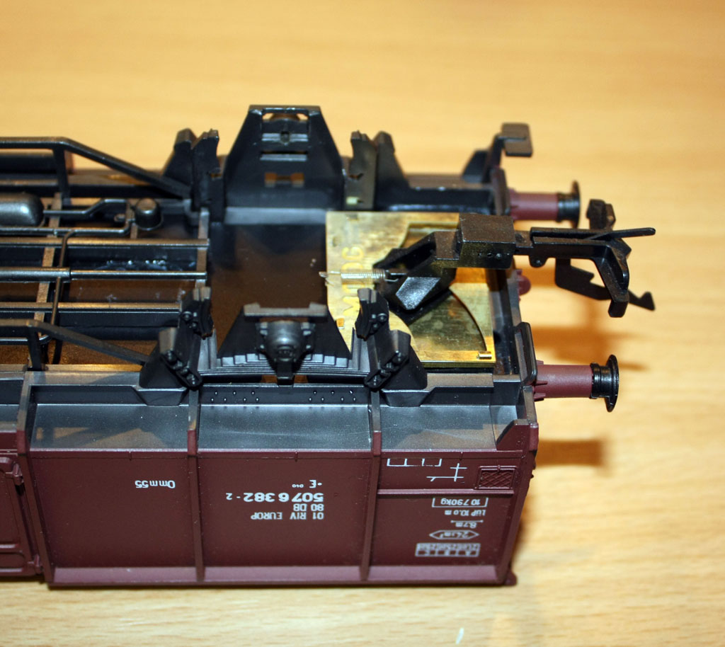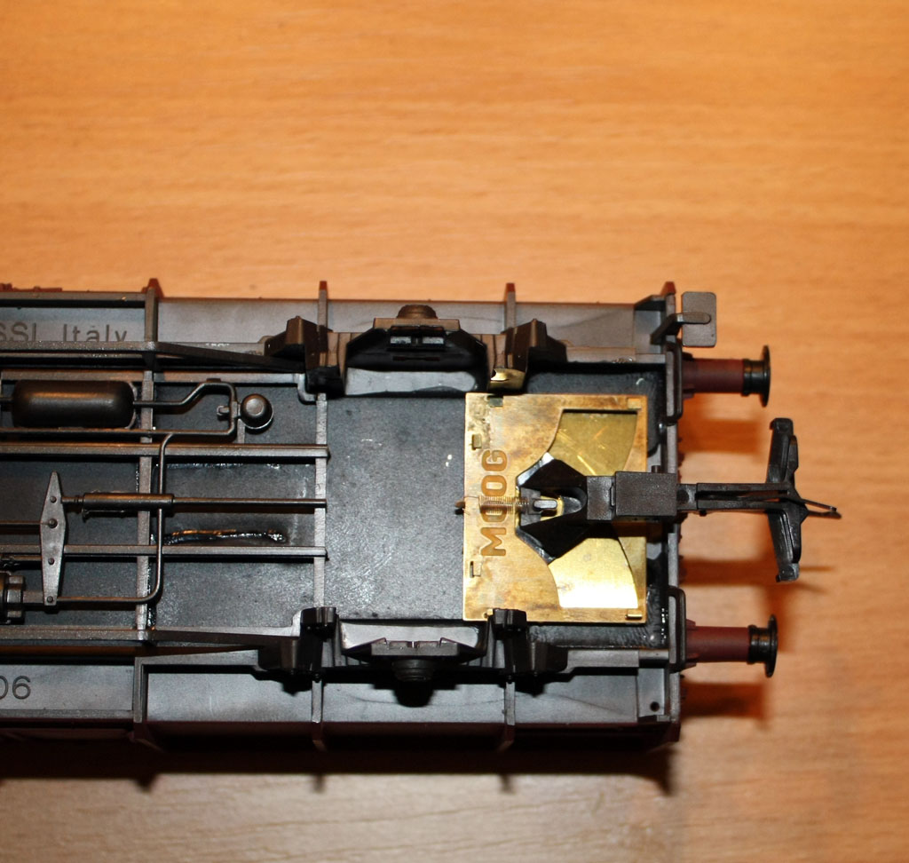 Die Ballastplatte wird nun in den Rahmen eingeklebt. Gleiches passiert mit dem gekürzten Einsatz. Auch die fertig von Moog fertig gelieferten Kulissenkupplungen werden nun einfach hinter der Pufferbohle eingeklebt. Da ich keine Federpuffer eingebaut habe, sondern die nichtfedernden Original-Puffer von Rivarossi am Fahrzeug gelassen habe, musste ich beim Einkleben der Kulissenkupplung auf den richtigen Abstand zur Pufferbohle achten. Die Kulissenkupplung ist richtig eingesetzt, wenn der Prallbalken der Kupplung knapp vor den Puffern steht. Der Abstand läßt sich justieren. Der Kupplungshaken ist mit einem Zapfen in die Kupplungsmechanik gesteckt und einem kleinen Splint gesichert. Dieser Split kann in eines von drei Löchern gesteckt werden, wodurch die Länge des Zapfens und damit die genaue Lage des Prallbalkens auch nach dem Einbau der Kulissenführung justiert werden kann.