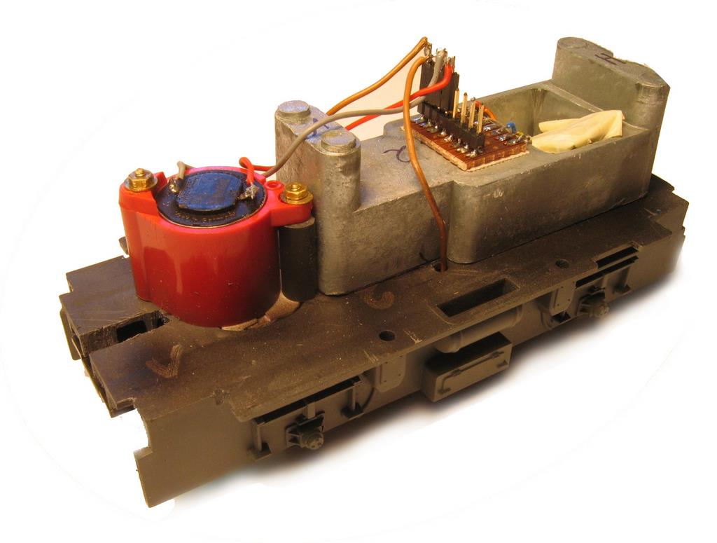 Ich entschied mich für den Antrieb der vorderen Achse, denn so erhielt ich ein freies Führerhaus. In die Aussparung des Gewichts passte ein kleiner Tams-Decoder, den ich über ein Platinenstückchen mit einer Steckverbindung mit den Anschlüssen verband.