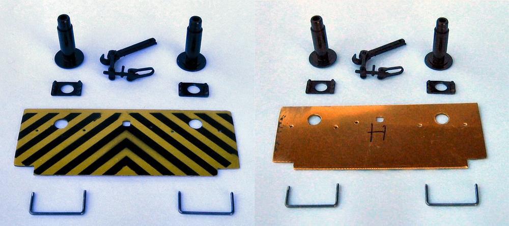Zur Aufnahme von Puffern, Kupplung, Rangiergriffen und Bremsschlauch sägte ich mir eine Messingplatte aus, die ich mit einer Schablone schwarz/gelb lackierte und mit 2-Komponentenkleber auf die Pufferplatte des Fahrwerks aufklebte.