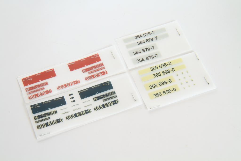 Wer seine Lok individuell beschriften möchte, kann das mit den Sets für die blau-beige Variante und die orientrote Lok tun. Für 42,- Euro bekommt man eine Beschriftung für die BR 365 in blau beige, für 35,- Euro gibt es die 365 oder 364-Beschriftung orientrot, jeweils für sechs verschiedene Betriebswerke.