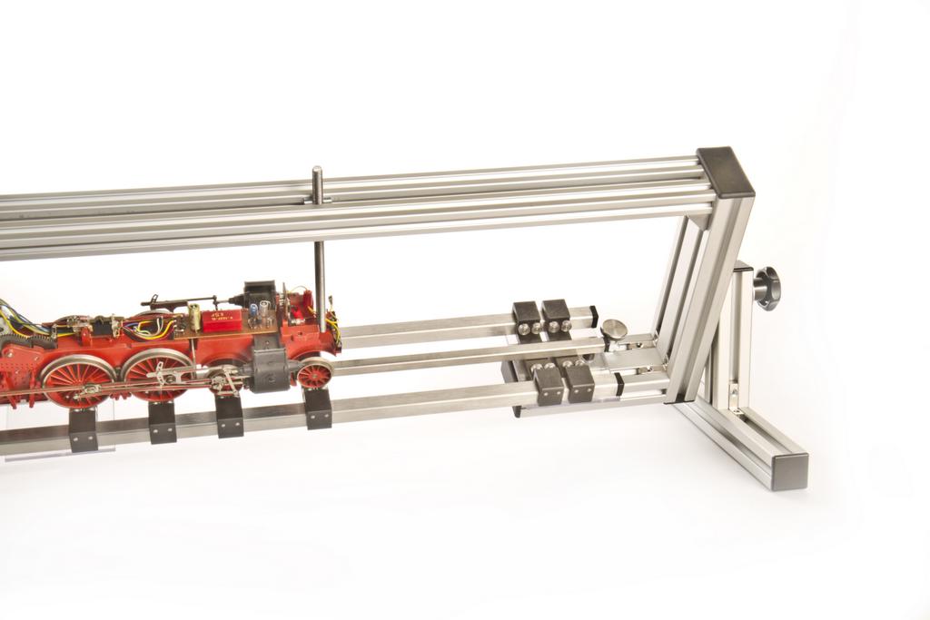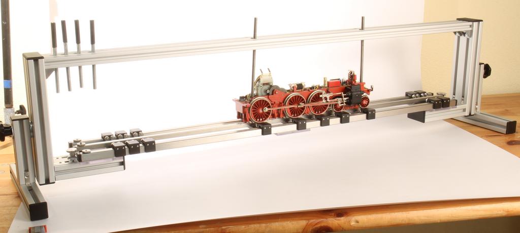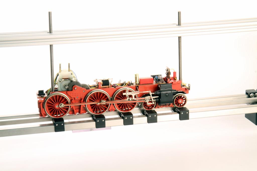Das neue Drehgestell-Werkzeug ergänzt die Funktion eines Rollenprüfstandes. Der Rollenprüfstand wird darin befestigt, die vollständige oder zerlegte Lok kann darin mittels Gewindestangen an geeigneter Stelle fixiert und gedreht werden. Bei Kunststoffmodellen muss man besonders auf eine stabile Stelle zum Fixieren achten.