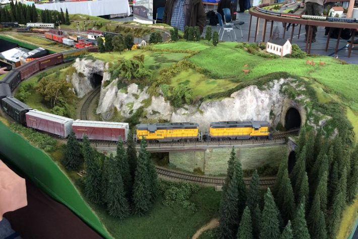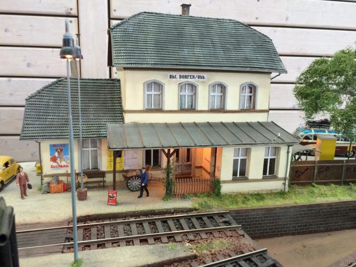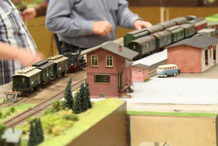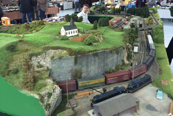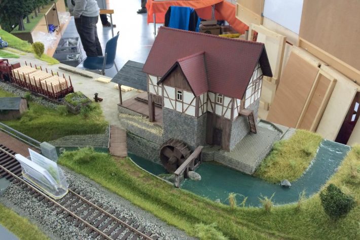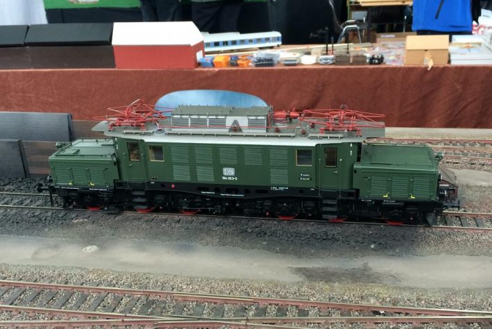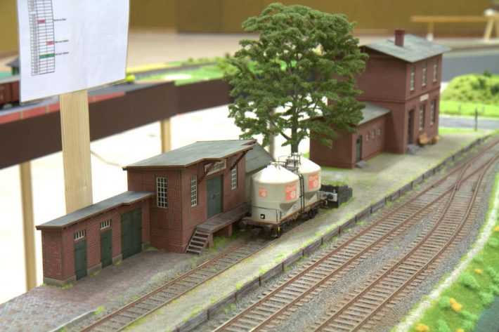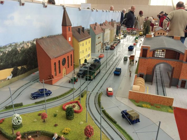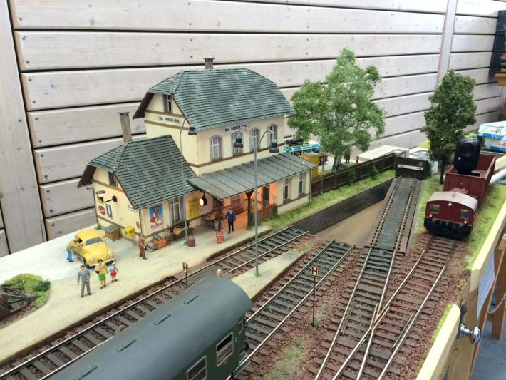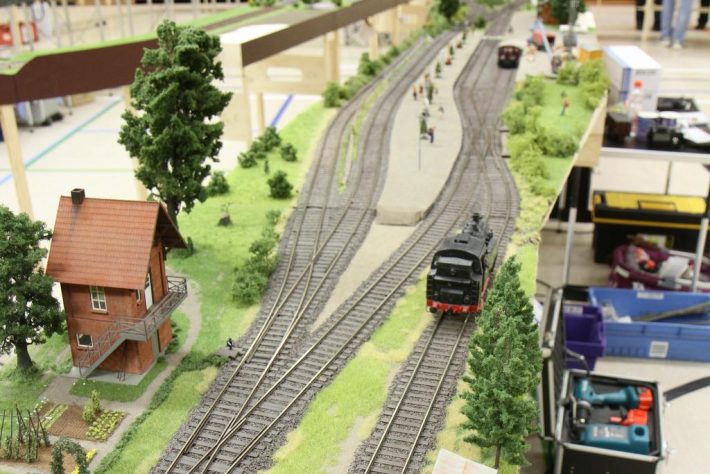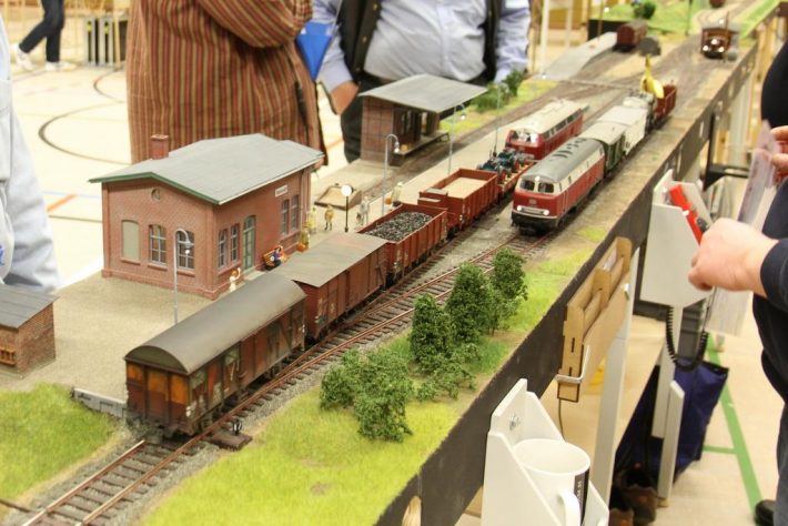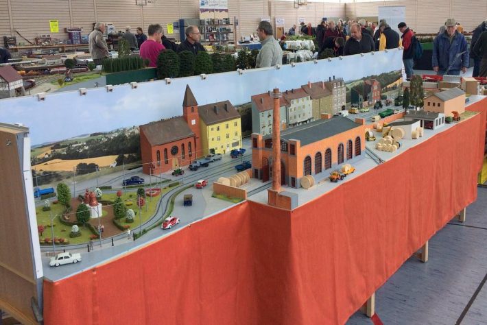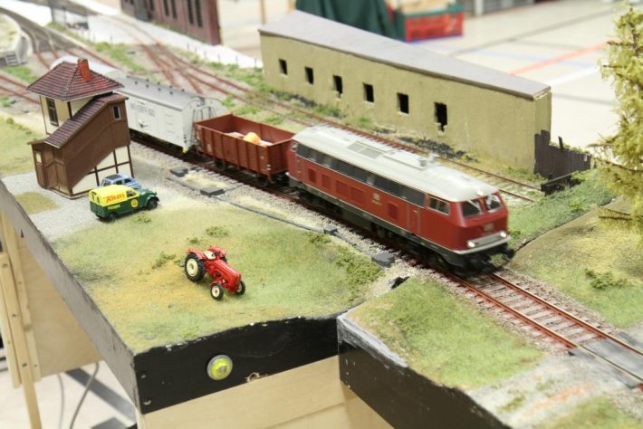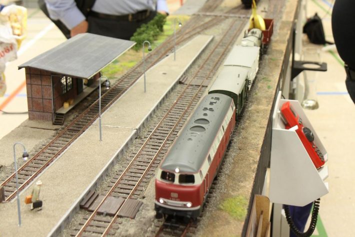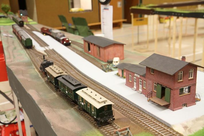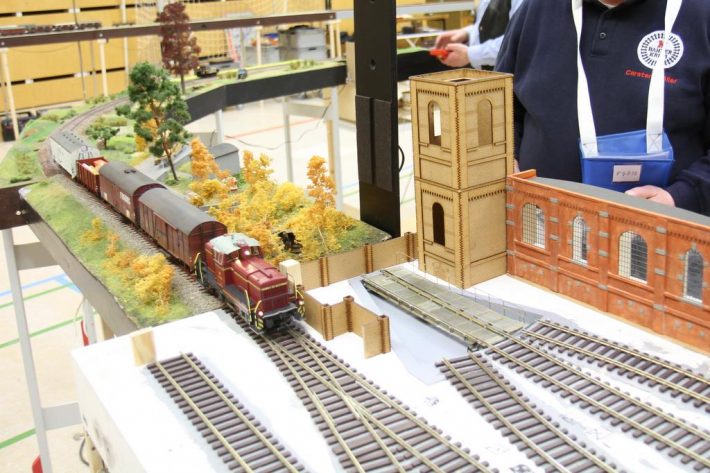 Neben der langgestreckten Punkt zu Punkt Anlage der Arge Spur Null gab es in der Markthalle Wismar auch die Anlage des Schweriner Modellbahnclubs zu sehen.