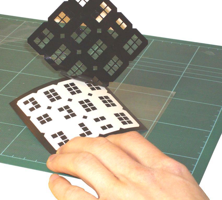 Die selbstklebenden Fensterrahmen werden von der Trägerfolie abgezogen