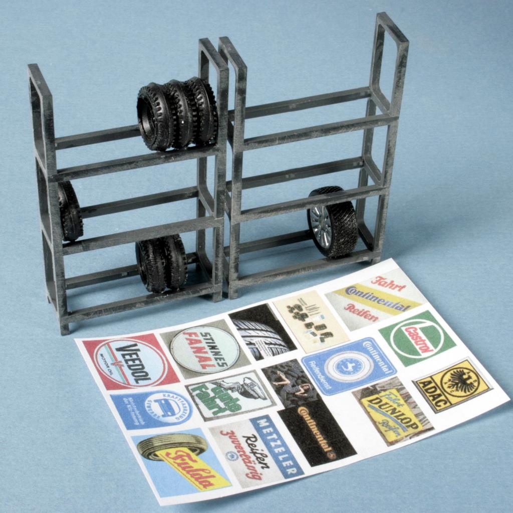Das Reifenregal ist ein Bausatz aus grauem Polystyrol, CNC-gefräst, komplett mit 8 Reifen. Den Bausatz gibt es für 9,85 Euro, das Fertigmodell für 13,25 Euro.