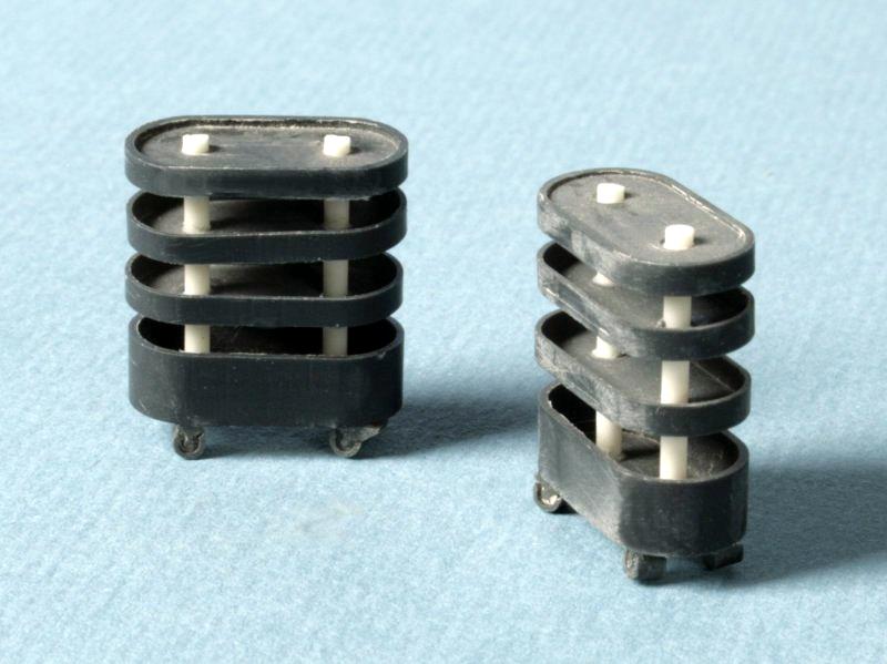 Die Zubehörteile der Tankstelle gibt es auch einzeln: Zwei Werkzeugwagen, ein 3-farbiger Bausatz aus durchgefärbtem Polystyrol, CNC-gefräst. Der Bausatz kostet 7,85 Euro, das Fertigmodell 11,65 Euro.