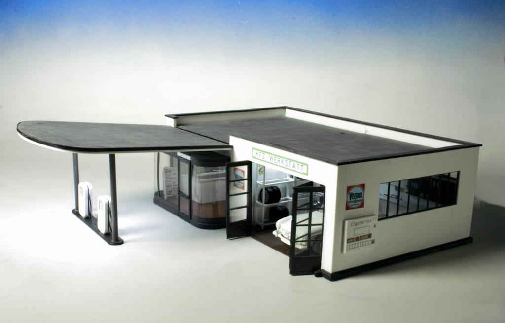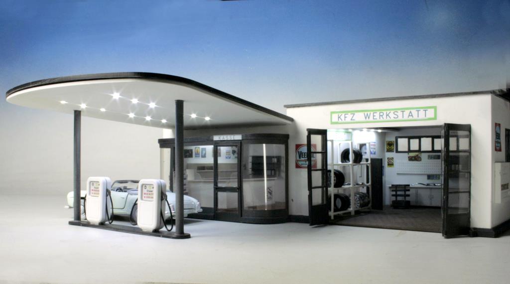 Die Tankstelle ist ein 5-farbiger Bausatz aus durchgefärbtem Polystyrol, CNC-gefräst, mit umfangreicher Inneneinrichtung: Theke, Zeitungsständer, Arbeitstische, Regale, Werkzeugwagen und Zigarettenautomat liegen dem Bausatz ebenso bei wie reichhaltige farbige Laserdrucke mit Plakaten, Werbeschildern und Preistafeln. Die Maße: Breite 30 cm, Tiefe 20,5 cm, incl. Vordach 35 cm, Höhe 10 cm.