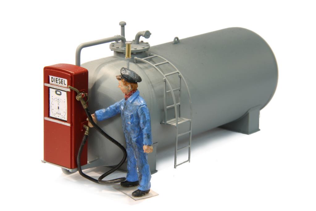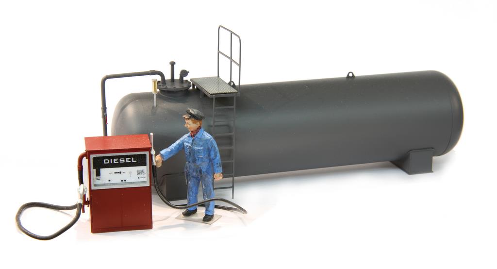 Von Addie lieferbar sind Bausätze zweier oberirdischer Tankanlagen, die zum Beispiel prima in größere und kleinere BWs passen: Die größere hat einen Tank von 13000 Litern und eine separat frei stehende Zapfsäule. Sie kostet 44,50. Der kleinere Tank (für 39,50 Euro) fasst 5000 Liter, dort ist die Zapfsäule am Tank montiert.