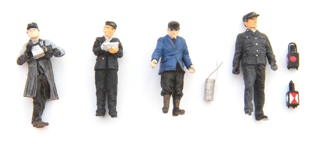 Die Kleidung entspricht dem Einheitsgrau oder –schwarz der Epoche 3 und 4. Die Figuren sind in Arbeitshaltung umgesetzt, der Rangierer kann auch an einen Güterwagen geklemmt werden. Der Weichenschmierer kommt mit langem Pinsel und Fettbehälter, der Laternenträger mit zwei (unbeleuchteten) Laternen.