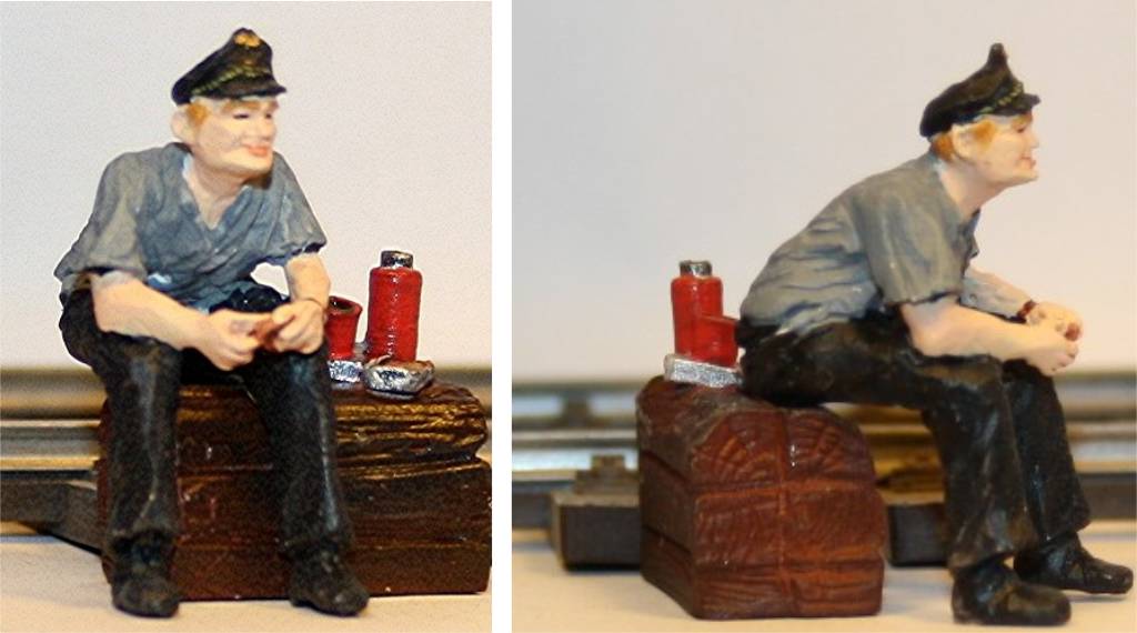 Ein Hemmschuhleger (12,50 Euro) passt in jeden Rangierbereich, der Lokführer mit weißem Hemd und Schlips (12,50 Euro) ist sicher nicht nur für die V160 geeignet. Unentbehrlich für jede Gleisbaustelle ist ein Eisenbahner Sicherungsposten mit Preßlufttröte (16,- Euro). Neu ist auch ein Eisenbahner bei der Brotzeit auf Holzstapel.