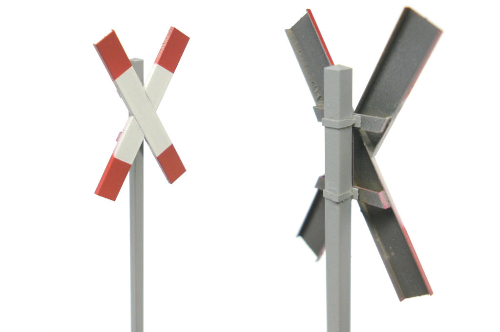 Bereits lieferbar ist ein Ätz-Bausatz für ein Paar Andreaskreuze Bauart DB für beschrankte und unbeschrankte Bahnübergänge. Er kann gelötet oder geklebt werden, eine Lackierschablone liegt bei. Der Bausatz für ein Paar Andreaskreuze kostet 12,80 Euro.