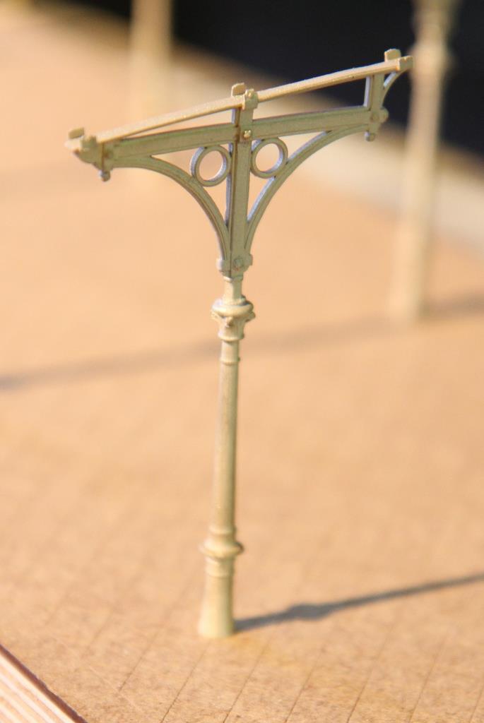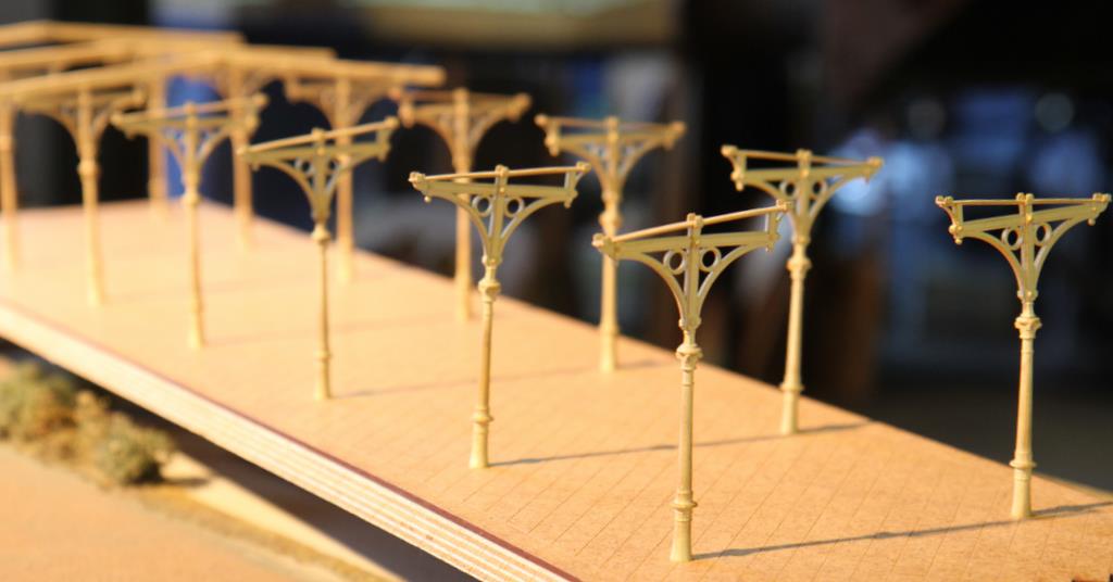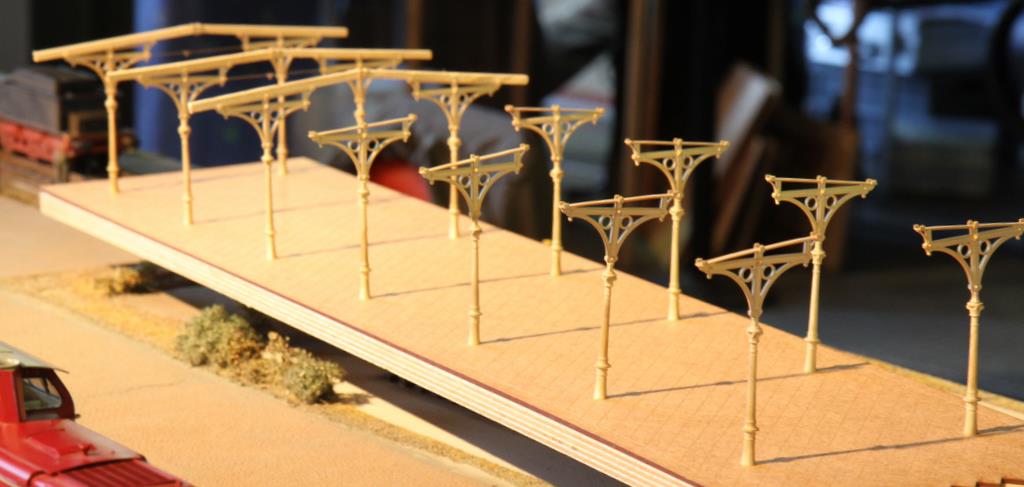 Modellbahn Demko bietet feine Bahnsteigstützen nach historischem Vorbild. Die Stützen sind schön verziert und tragen ein flaches Spitzdach. Sie sind solide aus Messing gegossen und können mit einem Zapfen stabil im Untergrund befestigt werden. Das Dach selber kann der Modellbauer aus ein paar Längslatten und einer geeigneten Deckung, zum Beispiel Dachpappe, selbst herstellen.