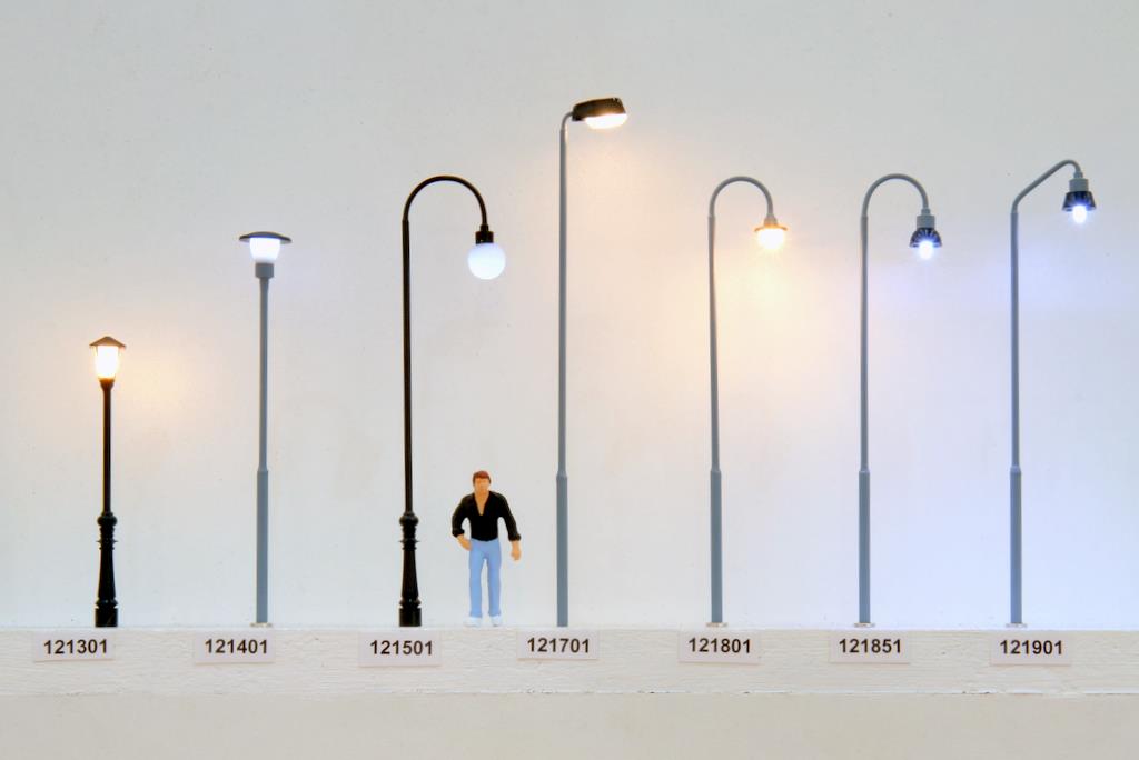 Der Spezialist für Modellbeleuchtung hat eine ganze Reihe von neuen Leuchten für Spur Null im Programm: Niedrige Leuchten für die Stadt oder den Bahnhofsvorplatz, Bogenlampen mit Kugel oder Reflektor, und hohe Stadtlampen für Plätze oder breite Straßen. Dazu kommen eine Reihe von Leuchten für die Wandmontage.