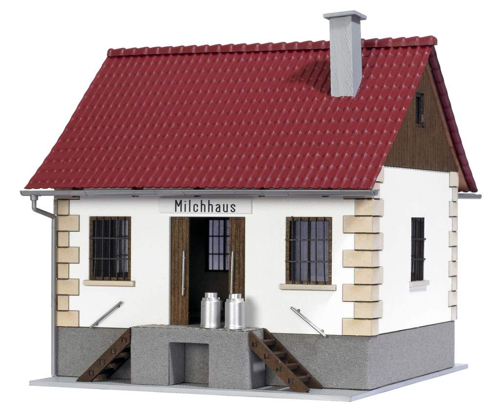 Milchhaus: Bausatz für eine ländliche Milchsammelstelle. Hier werden die von Bauern angelieferten Milchkannen vor dem Weitertransport in die Molkerei (auch Meierei) gelagert und gekühlt. Holz-Schiebetore zum Öffnen. Alle Teile fertig koloriert. Inkl. Ausschneidebogen mit „Milchmotiven“ und 2 Milchkannen. Zum Einbau der Beleuchtungssockel 4280 als Innenbeleuchtung vorbereitet. Abmessungen: ca. 150 x 150 mm, 155 mm hoch. Preis 99,99 Euro.
