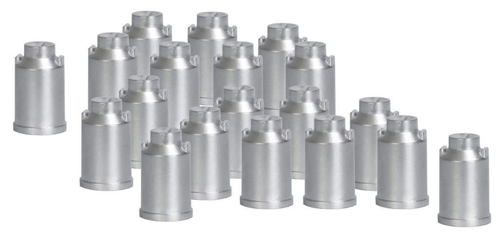 Milchkannen: 20 Milchkannen in Weißmetall-Optik. Ideal zur Ergänzung von Milchhaus und Holzkarren sowie als Ladegut für Spur-0 Fahrzeuge, das Set mit 20 Kannen kostet 16,99 Euro.