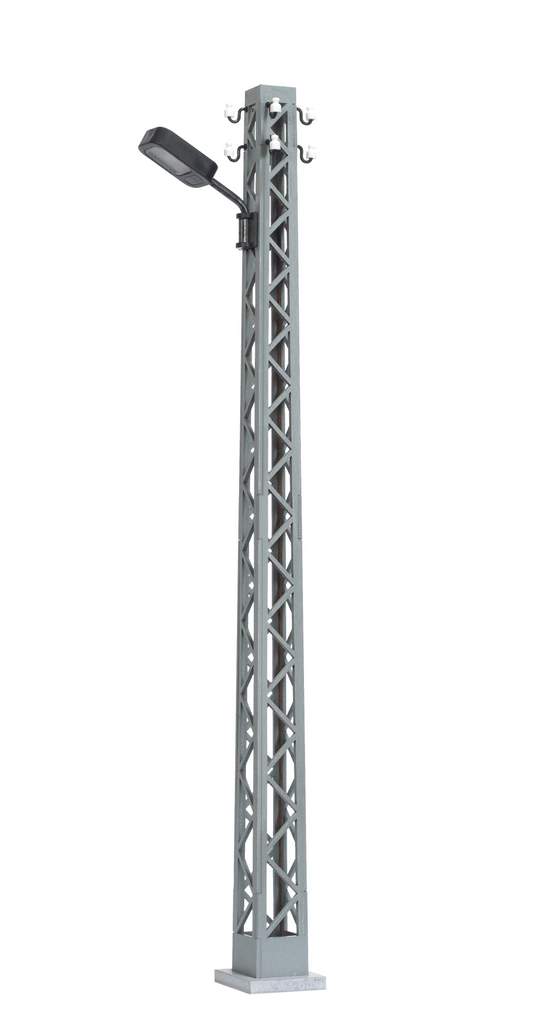 Gittermastlampe: Universell einsetzbar, auch für Bahnhofsund Industrieanlagen. Der Lampenkopf ist mit einer Streuscheibe zur optimalen Verteilung des realistisch kaltweißen Neon-Lichtes ausgestattet. An dem Gittermast mit den filigranen Isolatoren können noch bis zu drei weitere Lampenköpfe Nr. 10822 befestigt werden. Höhe: ca. 205 mm. Preis: 25,99 Euro.