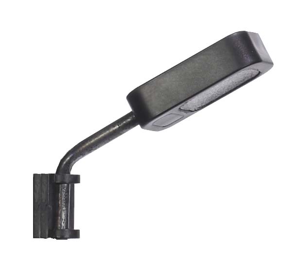 Wandlampe: Ansatzleuchte passend zur Gittermastlampe Nr. 10802. Für Bahnhofsgebäude, Güterschuppen, Industriegebäude, Stadthäuser und Straßenszenen. Der Lampenkopf ist mit einer Streuscheibe zur optimalen Verteilung des realistisch kaltweißen Neon-Lichtes ausgestattet. Sie kostet 14,99 Euro.