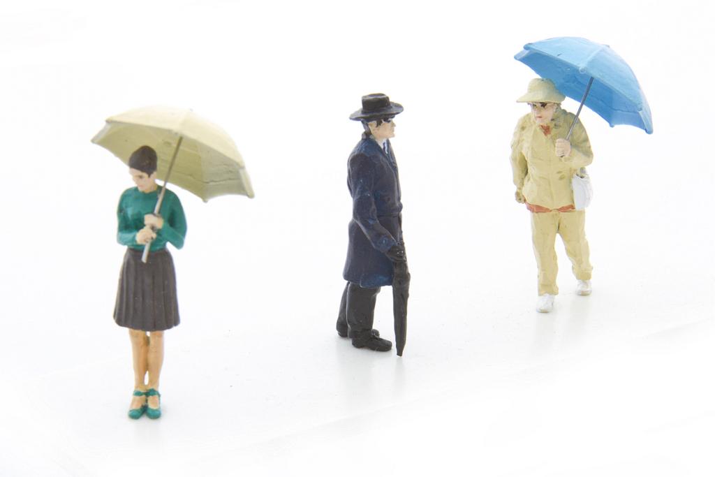 Von Schnellenkamp gibt es ein Dreierset von Figuren mit Regenschirm: Eine jüngere Frau im sommerlichen Rock, eine wetterfest gekleidete ältere Dame, und ein Herr im klassischen Trenchcoat. Die Figuren aus Zinnguss stammen aus der Feder von Bernd Hauser, sind aber ausschließlich über Michael Schnellenkamp zu beziehen. Die drei fertig bemalten Figuren kosten 50.- Euro.