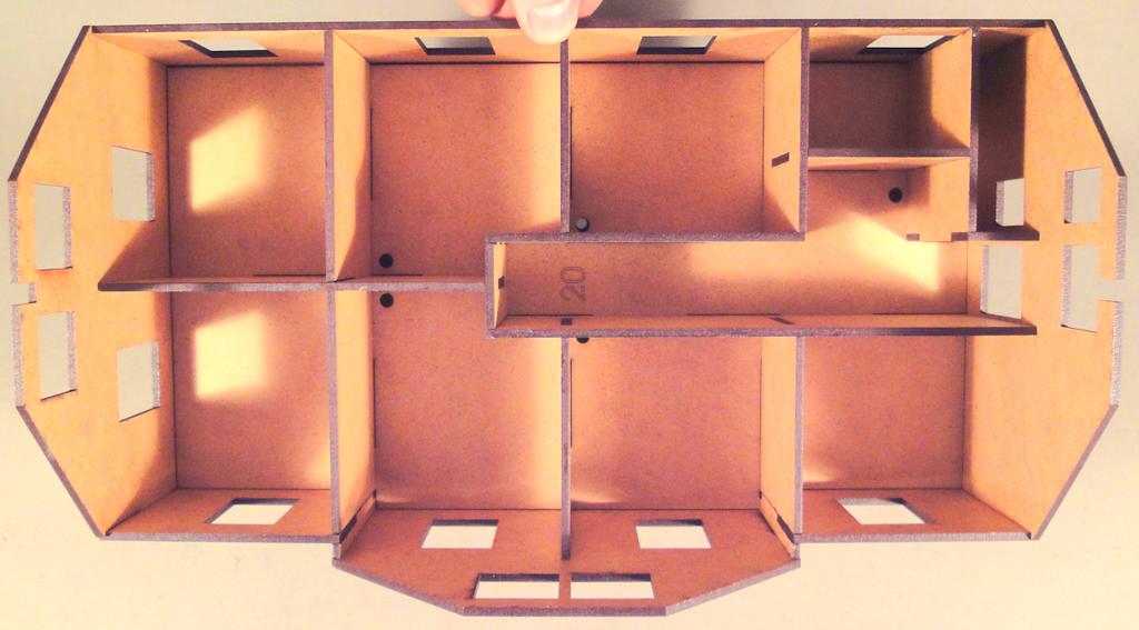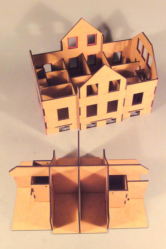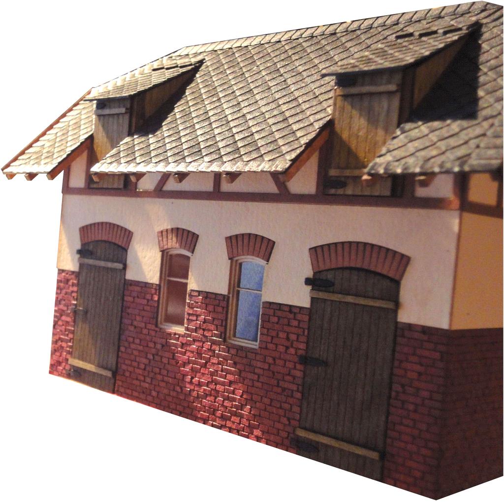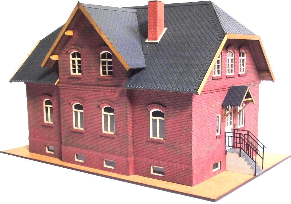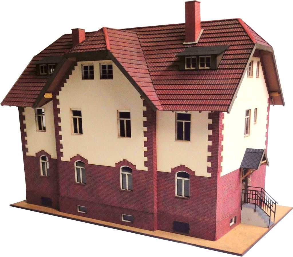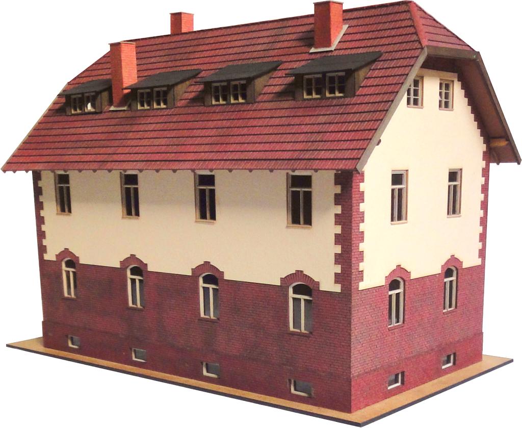 Die Firma Lasersachen von Hans Hopp stellt eine Reihe von Eisenbahnerwohnhäusern vor. Sie bestehen aus einem Kern aus 3 mm starkem MDF. Die Außenwände werden mit durchgefärbtem und gelasertem Karton beklebt.