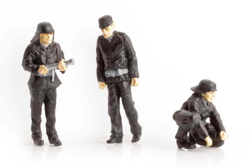 Von Hauser gefertigt, aber von Michael Schnellenkamp in Auftrag gegeben und nur dort erhältlich sind die drei Feuerwehrleute in Aktion. Sie bestehen aus Weißmetallguss. Keine allzu dramatischen Posen, sie passen an eine Einsatzstelle ebenso wie ans Gerätehaus zum Aufräumen. Eine fertig lackierte Figur kostet 13,- Euro.