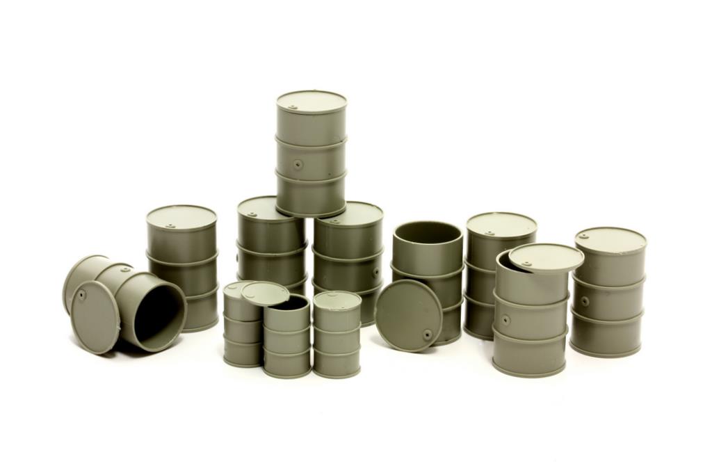Aus Polystyrol Spritzguss sind die 12 Stahlfässer, die Addie im Set anbietet. Erfreulicherweise sind die Fässer ohne Gussnaht hergestellt, nur der Anguss muss entfernt und verfeilt werden. Ein Beutel enthält neun Stahlfässer mit 200 Liter und drei mit 60 Liter Fassungsvermögen, jeweils mit Deckel, für 6,30 Euro.