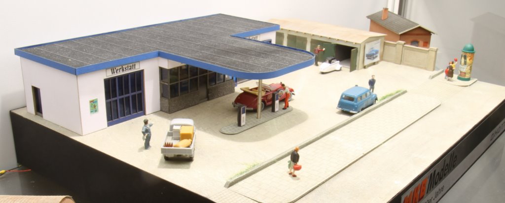 Kai Brenneis (MKB) stellt eine Tankstelle der 50er und 60er Jahre vor. Das Messemodell war in H0 gehalten, das Motiv wird aber auch in Spur 0 erscheinen. Der Bausatz wird, wie alle MKB Bausätze aus durchgefärbtem Karton in Lasertechnik hergestellt, mit einem stabilen Innenkern aus Architekturkarton. Die Garagen im Hintergrund sind bereits als Spur Null Modelle erhältlich.