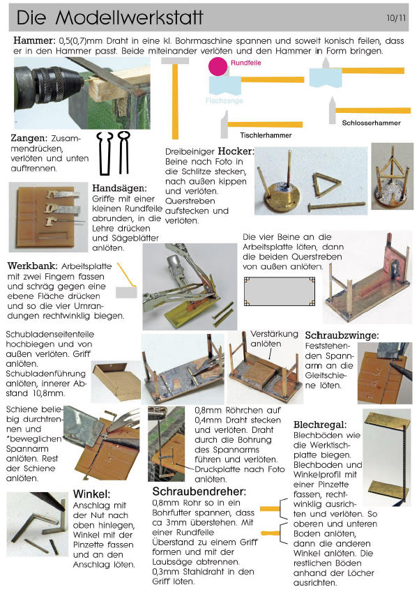 Die Werkzeuge und Bausätze sind nicht geätzt, sondern gefräst, und wirken dadurch eine besonders dreidimensional. Der Zusammenbau ist wegen der kleinen Modelle vielleicht etwas fummelig, aber nicht schwierig – gute Gelegenheit, ein bisschen das Löten zu trainieren.