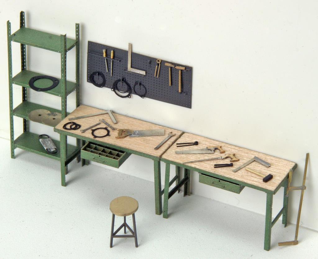 Eine ganze Werkstatt-Ausstattung ist von Petau zu haben: Die Bausätze sind auf Bruchteile von Millimetern genau gefräst und sind entsprechend hervorragend detailliert. Alle Bausätze kommen mit einer genauen Bauanleitung. Es gibt eine Werkbank mit Schublage, Stahlregal, Werkzeug, Werkstattuhr… und eine ganze Menge mehr. Eigentlich Pflichtprogramm für alle Betriebswerke, Autowerkstätten, Landmaschinenhandel…