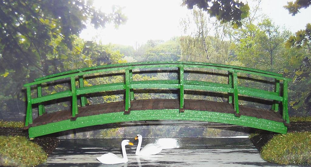 Geradezu lyrisch wird es mit der grünen, geschwungenen Monet-Brücke, die auch als Fertigmodell angeboten wird.
