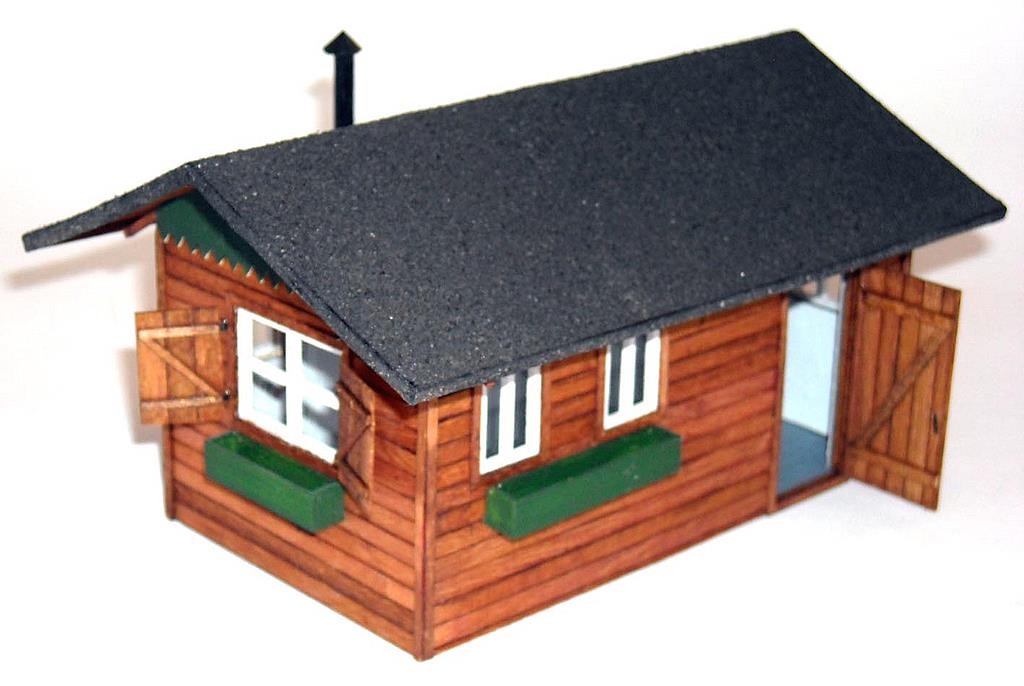 Neu ist auch eine durchaus komfortable Gartenlaube als Fertigmodell, gebaut aus einzelnen Balken, Brettern und Planken. Nur die Blumenkästen müssen noch bepflanzt werden. Die Grundfläche beträgt ca. 125 x 70 mm. Prima geeingnet für einen Schwebergarten am Bahndamm, ein ebenso vorbildgerechtes wie für Spur Null besonders geeignetes Motiv.