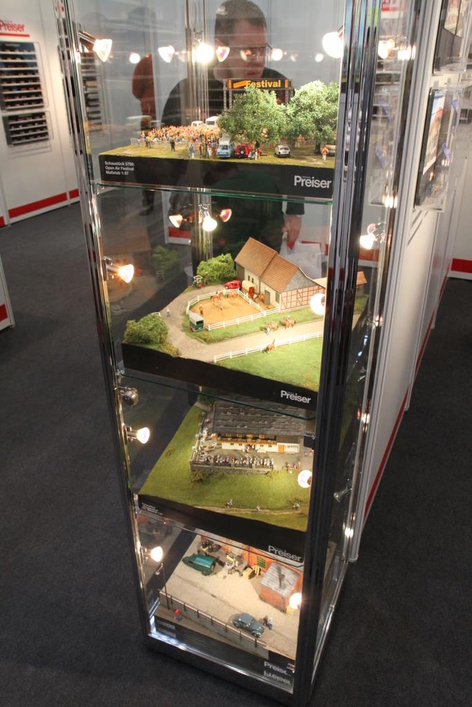 Auf der Messe in Nürnberg spielten die 0 Modelle eine sehr untergeordnete Rolle. H0 ist mit großem Abstand die dominierende Baugröße. Obwohl Preiser ein recht schönes Spur Null Diorama präsentierte, ist es unwahrscheinlich, dass es viele Leute wahrgenommen haben: Es wurde nämlich in Wadenhöhe präsentiert. Nur wer weit in die Knie ging, konnte einen Blick riskieren.