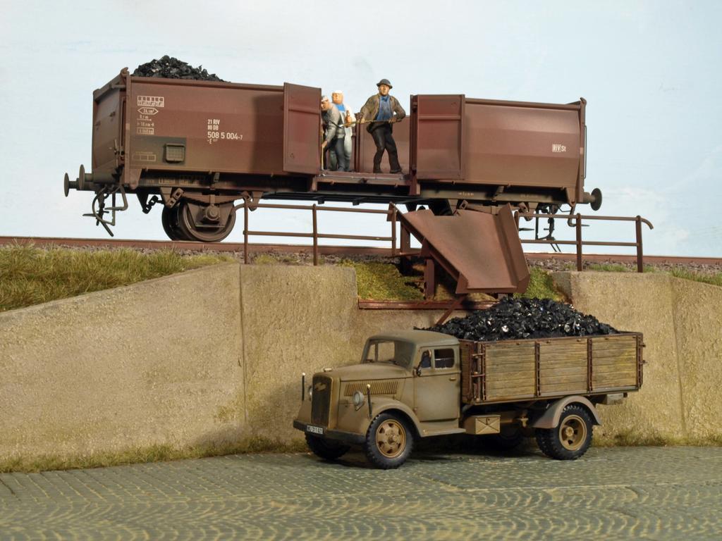 Vampisol bringt ein Modell der Mündener Rutsche für Schüttgüter. Sie besteht aus drei grau eingefärbten Spezialgipsbauteilen und einem lasergeschnittenen Teilesatz aus Acryl. Die Bühnenhöhe ist 68mm, die Länge des Gesamtbauwerk einschliesslich Flügelmauern 650mm, die Tiefe der Ladebucht 110mm. Der Bausatz kostet 36,- Euro.