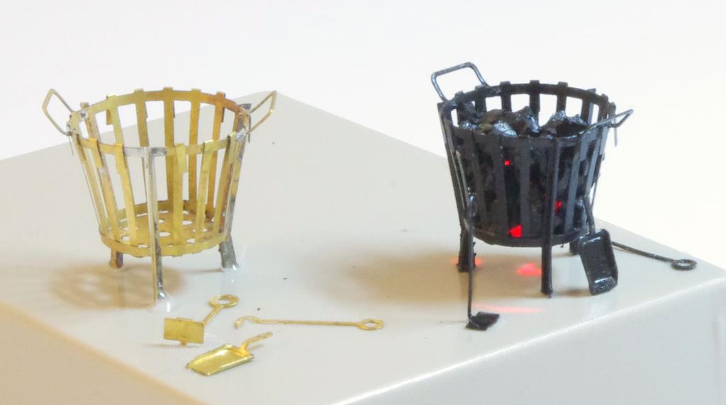 Die Kohlenkörbe im 2er Pack (Artnr. 6031) als Messingbausatz inklusive Schaufeln und Werkzeug bekommt man für 10,– Euro.