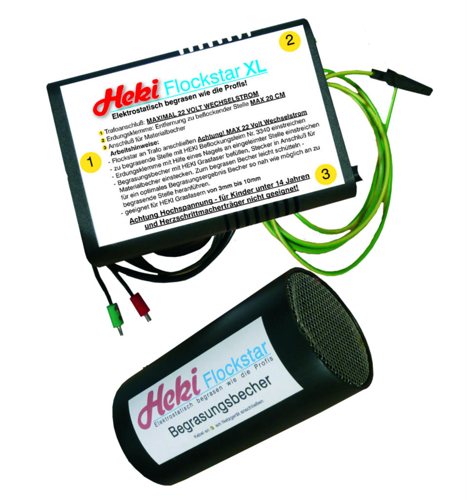 Der Flockstar XL hat eine verstärkte Leistungsabgabe und kommt komplett mit Netzteil, Begrasungsbecher und 20 Gramm Grasfaser.