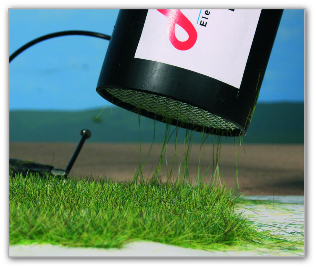 Passend zu den langen Grasfasern ist auch ein elektrostatisches Begrasungsgerät zu haben. Der Flockstar XL wurde speziell für die langen Grasfasern entwickelt, kann aber auch für die kurzen Fasern eingesetzt werden. Er kostet 210 Euro und wird im Laufe des Jahres ausgeliefert.