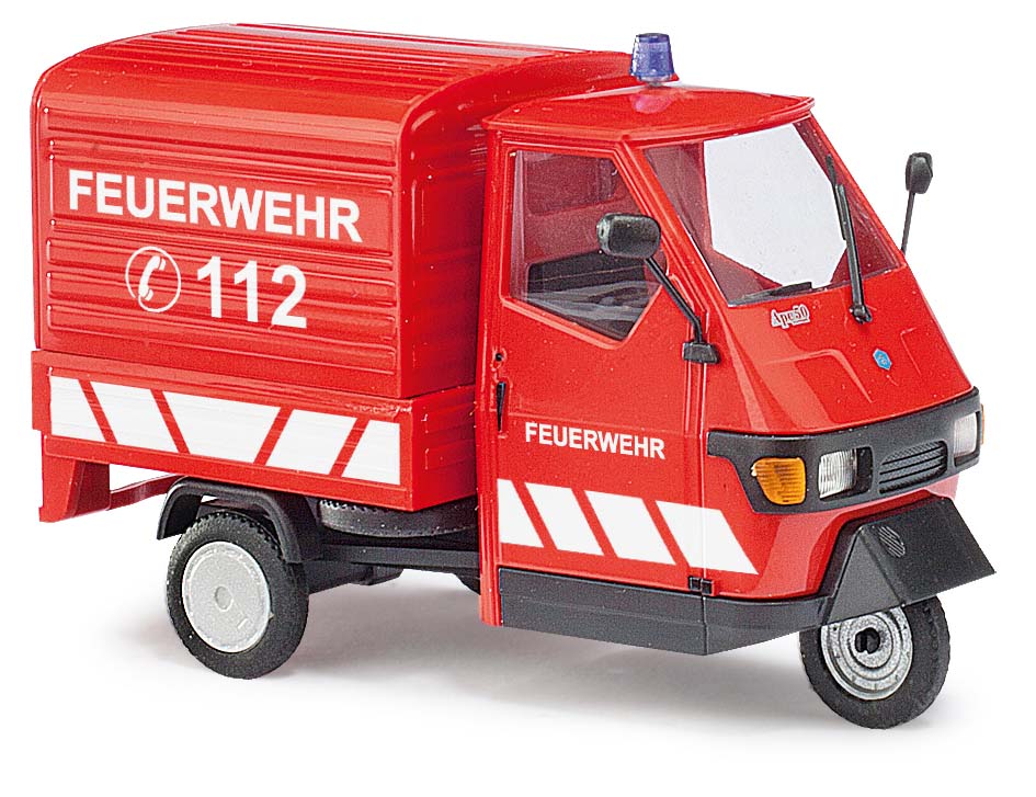Die Firma Busch stellt auf der Messe 2013 (fast) keine eigenen Spur Null Neuheiten vor, präsentiert aber das M.T.H. Sortiment. Tapfer schwenkt der kleine Lieferwagen Ape das Neuheitenfähnchen, es gibt in 2013 eine Ausführung als Polizei- und Feuerwehrfahrzeug, zusätzlich zu den vier Versionen mit Pritsche und den vier mit geschlossenem Laderaum.