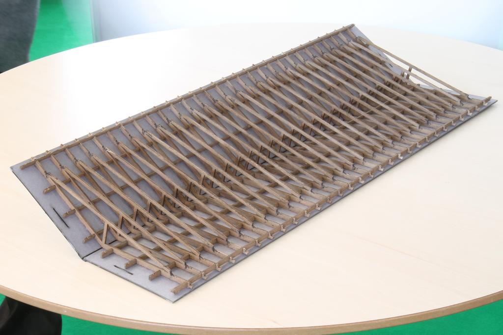 Bodenbelag und Dachsparren bestehen aus Echtholz, die Dachpappen-Dachdeckung aus Karton mit Pertinax-Träger darunter.