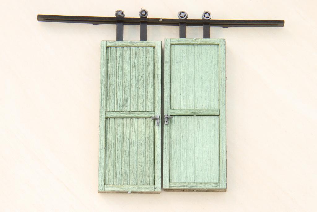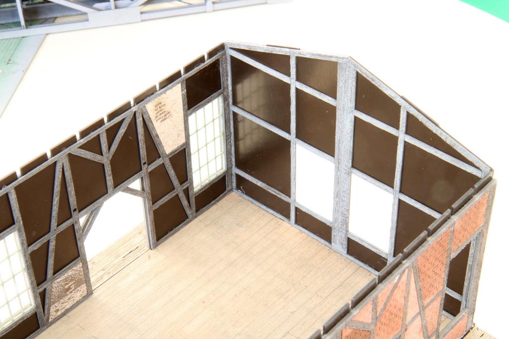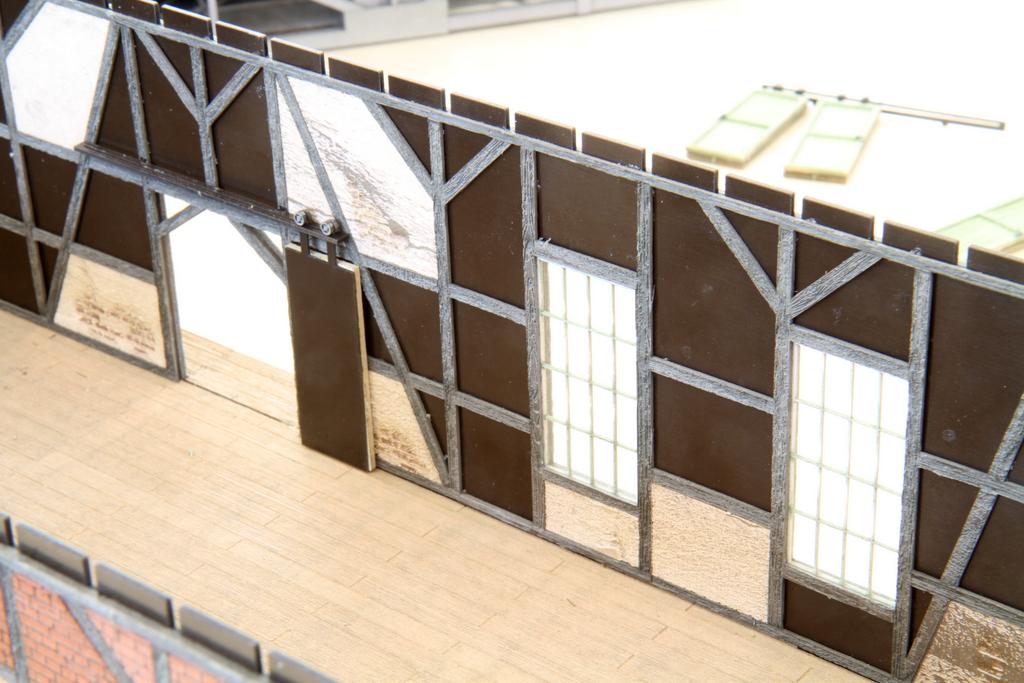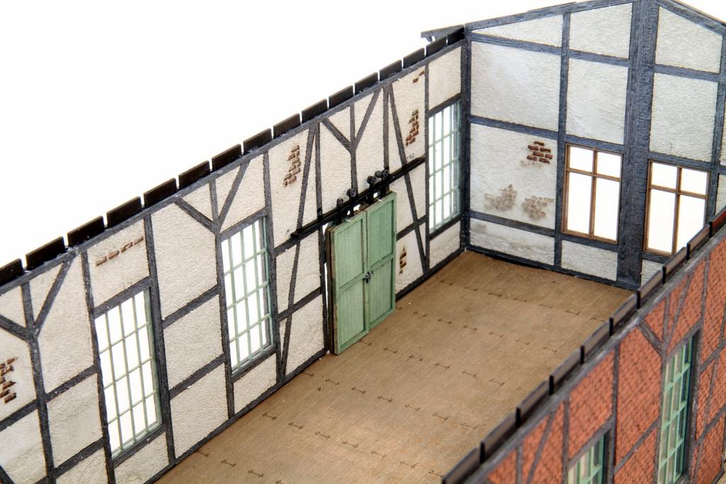 Die tragenden Wände es Schuppens sind aus dem glatten und stabilen knapp 1 mm starken Material gelasert, die Wände werden dann außen und innen mit durchgefärbtem Karton beklebt. Weil die tragende Wand so dünn ist, kann der Karton etwas dicker ausfallen und das ausgelaserte Relief viel deutlicher ausfallen. Das Ergebnis ist eine beeindruckende Stabilität und gleichzeitig überzeugende Oberflächengestaltung, ohne dass man selber pinseln müsste. Abgeplatzer Putz, Fach- und Mauerwerk werden überzeugend dargestellt.
