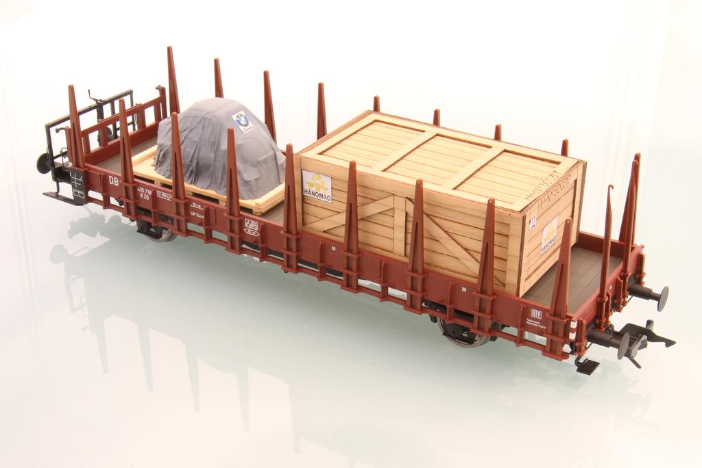 Der Ladegutspezialist stellt zur Messe vier neue Produkte vor: Die Frachtkiste mit Hanomag-Beschriftung ist ein Fertigmodell aus gelaserten Holzteilen. Sie ist für alle Flachwagen geeignet und kostet 10,90 Euro. Die BMW Isetta unter der Plane ist für 13,70 Euro zu haben.