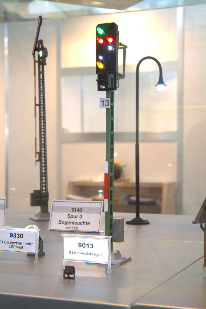 Immerhin eineinhalb von sechs Seiten widmet Viessmann im Neuheiten-Prospekt der Spur Null. Abgebildet sind dort ein Licht-Einfahrsignal und ein Licht-Ausfahrsignal, ganz offenbar H0 Modelle, wie an dem Sockel sehr leicht zu erkennen ist. Aber die Prototypen standen in der Vitrine.