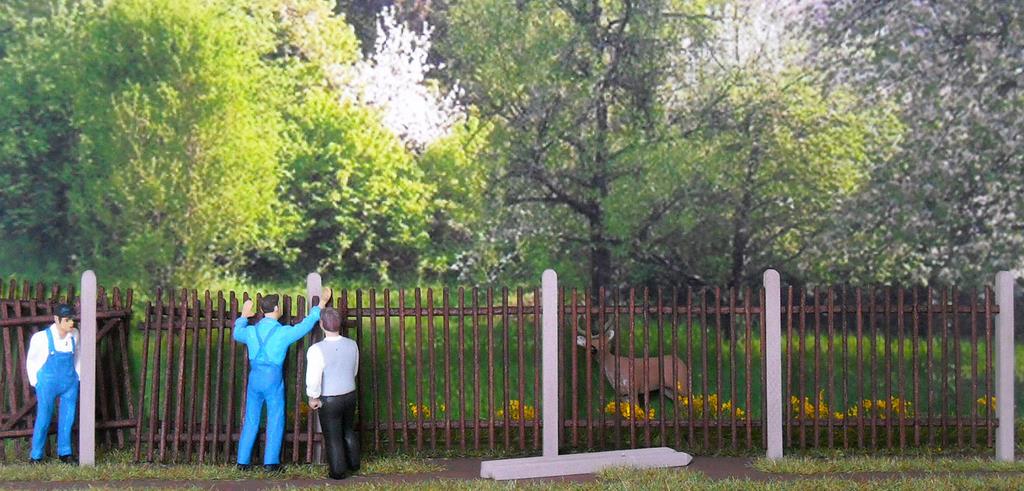 Ab Oktober liefert Paulo als Neuheit einen Waldlattenzaun aus. Die Latten sind vorbildgerecht halbrund, die Lattenspitzen sind gekegelt. Der Zaun ist zwei Meter hoch und pro Sektion zweieinhalb Meter breit, macht ca. 45 x 55 Millimeter im Modell. Dazu gibt es Betonpfosten mit zwei Bohrungen zum einstecken der horizontalen Latten.