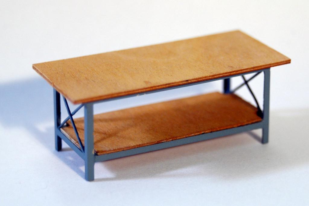 Das Gestell der Werkbank und auch die Böcke sind aus Messingprofilen in Handarbeit hergestellt, die Holzauflage besteht aus gebeiztem Sperrholz. Die Modelle werden fertig montiert geliefert. Sie passen in beliebige Werkstätten, Lokschuppen und Betriebswerke.