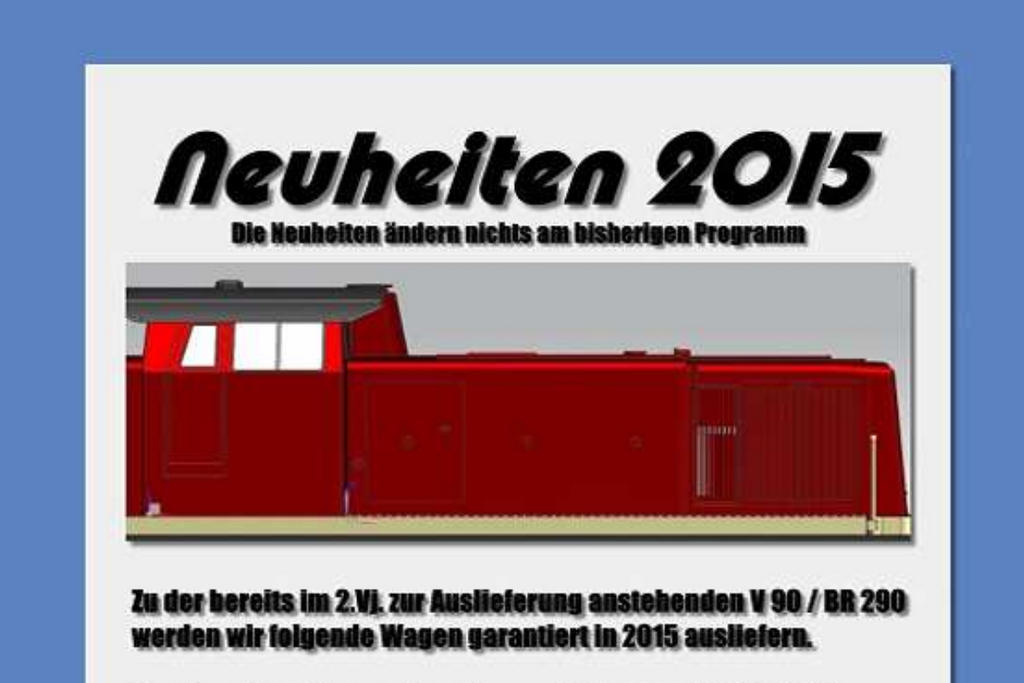 Die Rangierlok V90 / BR 290 soll bereits im zweiten Quartal 2015 und damit in wenigen Monaten erscheinen, mit den von der V80 bekannten Eigenschaften: Mittelmotor mit Kardan, kugelgelagerte Getriebe, digitale Vollausstattung mit ESU Dekoder inklusive elektrischer Kupplung beidseitig. Der Preis wird 699.- Euro betragen.
